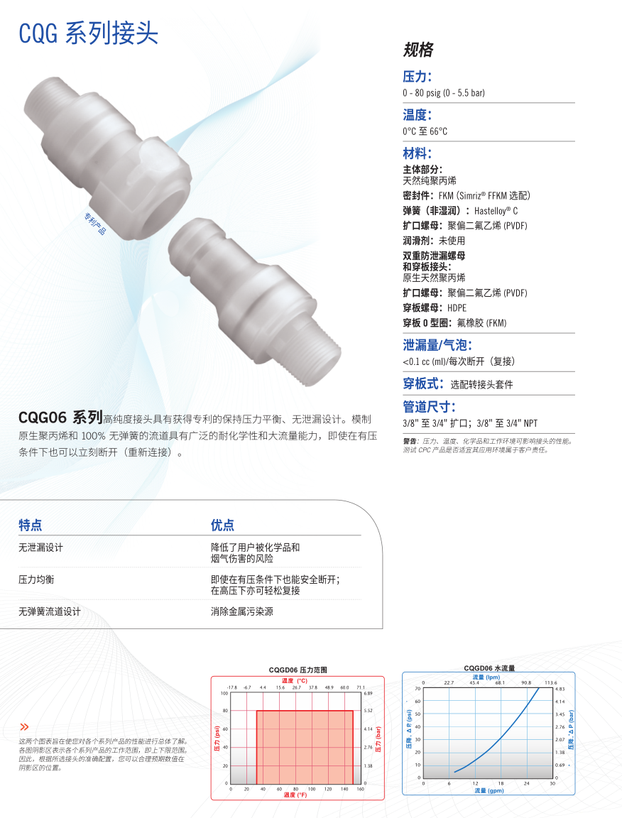 CQG Series high purity couplings feature our patented pressure-balanced, non-spill design. Molded virgin polypropylene and a 100% springless flow path provide broad chemical resistance and exceptionally high flow capacity, allowing instant disconnects (and reconnects), even under pressure.
